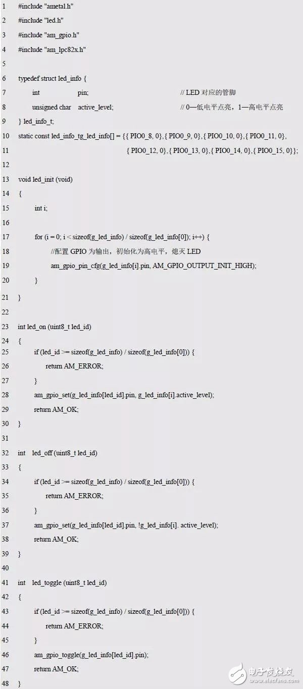显然LED 只有点亮、熄灭和翻转3 种操作,如果我们不在乎抽象性的话,则可以直接调用AMetal 函数实现。抽象的方法在操作LED 的实现代码和使用操作LED 的代码之间添加一个函数层,创建一个定义明确的接口,正确的抽象性是将对象的实现和它的接口分离。即将操作LED 的方法“声明”函数原型如下: