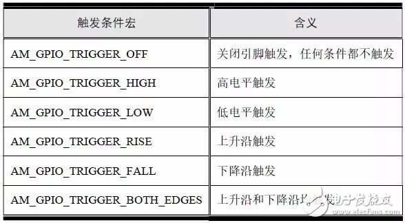 注意,这些触发条件并不一定每个GPIO 口都支持,当配置触发条件时,应检测返回值,确保相应引脚支持所配置的触发条件。细心的人可能会发现,这里的参数flag 为单数形式,而am_gpio_pin_cfg()函数的参数flag 为复数形式。当参数为单数形式时,则表明只能从可选宏中选择一个具体的宏值作为实参;当参数为复数形式时,则表明可以选多个宏值的或值(C 语言中的“|”运算符)作为实参。