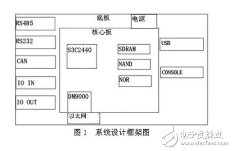 图1系统总体结构是采取核心板跟底板的结构。核心板的资源包括S3C2440A的基于ARM920T核的处理器,其内部集成了许多外设,可以很容易地对处理器进行扩展,形成各种不同的控制/通信接口。存储系统方面核心板上扩展了64M的SDRAM,256M的NAND FLASH,以及2M的NOR FLASH,能够满足一般的工业控制需求。另外核心板上还集成着DM9000以太网控制芯片。在底板上利用S3C2440处理器上的功能模块,再加上外围电路,形成各种接口的扩展,其中包括有半双工的RS485、RS232、CAN通信模块、IO数字量口输入、IO口数字量输出。