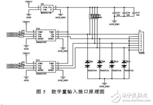 数字量的输入输出可以直接控制ARM的引脚为GPIO功能而实现,输入和输出具有相同的原理。一般控制系统需要工作在恶劣的环境中,电压值会产生突变,而且一般都高于ARM处理器可接受的范围,所以必须采取一定隔离措施,需要外接隔离芯片。隔离芯片在电路中起到三方面的作用:1)隔离了破坏电压,防止处理器受到破坏性损坏;2)完成逻辑电平的转换,将工业控制中的信号逻辑电平转换为嵌入式处理器所允许的逻辑电平;3)隔离噪声,抑制共模信号。在本设计中采用的是ADI公司的ADuM1200数字隔离器。这款数字隔离器采用的是iCoupler磁隔离技术,无论在性能、工号体积等各方面都有传统的光电隔离器无法比拟的优势,具有比光电耦合器更高的数据传输速率,时序精度和瞬态共模抑制能力。在一个芯片上集成了两个独立的隔离通道,两端工作电压为2.7V~5.5V,每个隔离通道具有很低的脉宽失真,而且还具有直流校正功能。综合上述各优势,是本设计中采取该隔离芯片的原因。