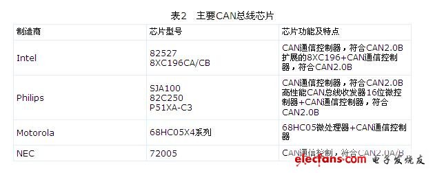 由于CAN总线的迅猛发展,许多芯片厂商开发了很多系列的CAN通信控制器芯片。如表2所示。
