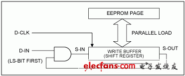 串口EEPROM的一个常用功能是充当写入页的缓存器,能够一次编程整个存储器页。收到写命令时,系统自动装载包含寻址存储器数据的页缓存器内容。对于EPROM仿真模式,按照移位寄存器写缓存器(图2)。输入新数据(D-IN)送到一个“与”门,在进入缓存器(S-IN)之前将其与缓存器数据(S-OUT)相组合。因此,“与”门确保存储器位在置为0后不会变为1。经过一个完整的页操作周期后,缓存器的数据再次与存储器页中的数据对齐。随后可以开始一个写周期,将整个缓存器内容复制到非易失EEPROM。