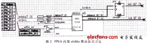 (1) 接收部分:由编码和缓存两部分组成。由于链路口的数错是DDR形式的,不方便数据的缓存,本文采用QuartusII Megafunctions中的altddio模块将上升沿数据和下降沿数据分开。注意这个模块的下降沿数据输出会滞后上升沿数据1个时钟周期,输出时应该用链路口时钟信号(LxCLKIN)通过D触发器来将数据对齐。该模块的inclock一定要用链路口时钟信号以保证数据的正确读取,如图2所示。又由于DSP内部数据是32位的长字,所以写入接收缓存前应该用一组D触发器将数据进行32bit对齐,这里注意DSP链路口先传输32位数据中的低8位。
