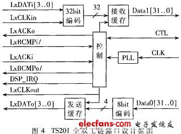 图4给出了FPGA与TS201进行链路口通信的设计框图。由于TS201的握手信号较多,所以相对TS101的链路口设计容易些。本设计FPGA时钟50MHz,TS101核时钟500MHz,链路口时钟为DSP核时钟的4分频,采用4bit方式,单向实际数据传输速率为125MBps。
