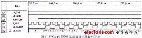 TS201链路口的收发机制非常相似,本文仅给出发送数据时序图,如图5所示。L1_IRQ是FPGA发给DSP的外部中断,用来通知DSP收数据;L1_ACKI是DSP的接收准备好信号;R_BUF_EN是读发送缓存使能信号;链路口时钟L1_CLKOUT是以读缓存时钟R_CLK下降沿的二次分频,对应从缓存中读出的4bit链路口数据L1_DA-To。注意这里读缓存及时钟分频时会有纳秒级的延迟。