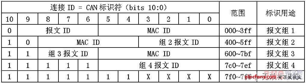 由于CAN采用非破坏性的仲裁方法,因此,标识符决定了块信息传送的优先权和信息等待时间,信息标识符的分配的方法被认为是 CAN系统的主要结构元素,它同时也影响了信息滤波和标识符的使用效率问题。