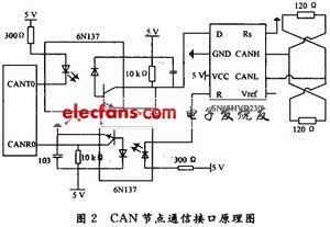 CAN总线的收发器选用TI公司的SN65HVD230芯片,该芯片正常模式下的低电流设计使得芯片的发热量小(典型数值为370μA),而且其优化的驱动器设计使得信号质量得到进一步改善;为进一步提高系统抗干扰能力,在主控芯片C80C51F040和收发器SN65HVD230之闻加入光耦6N137进行电气隔离,由于通信信号传输到导线的端点时会发生反射,反射信号会干扰正常信号的传输,因而总线两端接有终端电阻以消除反射信号,有效隔离CAN总线上的干扰信号,提高了系统可靠性。如图2所示。
