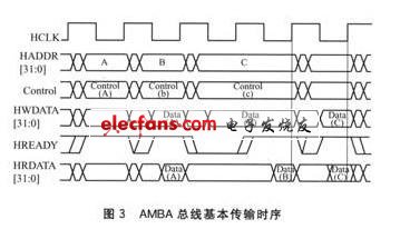 AMBA(Advaneed Microcontroller Bus Architecture)总线规范是ARM公司设计的一种用于高性能嵌入式系统的总线标准。AMBA总线规范是开放标准,通过ARM公司的授权就可以免费获得。它独立于处理器和制造工艺技术,增强了各种应用中的外设和系统IP核单元的可重用性。2.O版AMBA标准定义了3组总线:AHB(AM-BA高性能总线)、ASB(AMBA系统总线)、和APB(AM-BA外设总线)。AHB总线应用于要求高速度高带宽的系统。本文以AHB总线为例,说明OCP -IP如何集成到SOC系统总线上。AMBA总线基本传输时序如图3所示。HCLK表示AMBA系统时钟,HADDR[31:0]表示32位地址总线, HWDATA[31:O]表示32位写操作时的数据总线,HREADY是AMBA总线的读写状态信号(状态为低电平时,表示一次读写操作完成), HRDATA[31:0]表示读操作时的数据总线。