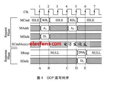 OCP-IP核的功能是可裁剪的,即OCP-IP的大部分信号都是可选择的。根据核的功能,选择使用不同的信号。OCP协议*有三大类型号:数据流信号 (dataflowsignals)、边带信号(sideband)、测试信号(test signals)。数据流信号主要包括:基本信号(basic signals)、简单扩展信号(simple extensions signals)、突发扩展信号(burst exten-sions signals)和线程扩展信号(thread extensions signals)。边带信号主要包括:复位(。Reset)、中断(Interrupt)、错误(Error)等信号。测试信号主要包括用于支持扫描 (Scan)、时钟控制和IEEE 1149.1(JTAG)的信号。此处用到的OCP信号包括:Reset(复位)、Clk(时钟)、En-ableClk(时钟使能)、MAddr(地址)、MCmd(命令)、MData(数据)、SCmDACcept(命令接受)、SData(Slave数据)、SResp(操作成功标志)。简单的 OCP读写时序如图4所示。Request Phase表示请求阶段,Response Phase表示响应阶段。A处由系统Master发出1个WR写命令,并给出地址A1和数据D1。随即Slave发出命令接受响应ScmdAccept,此处一个周期完成了一个写周期操作,不需要Slave给出写操作成功响应。C处系统Master发出一个RD读命令,并给出要读取的地址A2。Slave 随即给出命令接受响应信号SCmdAccept,在下一个时钟周期D处Slave给出要读取的数据D2并在Slave响应信号SResp上给出读操作成功标志DVA。此处读操作用了2个时钟周期。