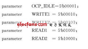 OCP-IP跟AMBA总线的通信通过设计2个状态机来实现,1个用于接收AMBA总线上的流水数据,1个用于发送接收的数据并以OCP标准的方式发送。接收数据的状态机编码如下: