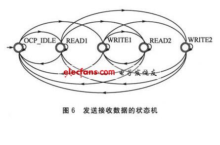 状态转移图如图6所示。当接收数据的状态机接收到AMBA总线上的命令时,状态机让OCP接口进入第1个读写操作状态,即READl状态或者WRITE1 状态。如果AMBA总线上有持续的流水操作命令,状态机进入READ2状态或者WRITE2状态,即在AMBA流水操作的条件下,以1结尾的状态的下一个状态一定是以2结尾的状态,反之以2结尾的状态的下一个状态一定是以1结尾的状态。