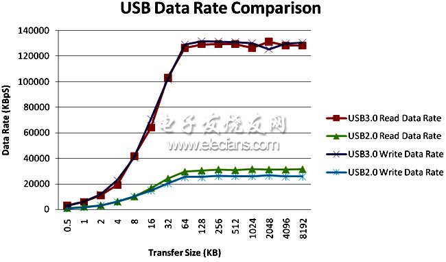 USB 2.0和USB 3.0的基本区别是带宽。USB 2.0所提供的理论带宽是480Mbps。事实上,收到的最大吞吐量约为320Mbps (40MBps),它大致是理论值的三分之二。使用USB3.0,数据吞吐量为4.8Gbps。如果我们用相同的比例,那么预期的数据速率是3.2Gbps (400MBps)。然而,许多开发人员希望能提供更高的吞吐量。图1显示了USB 3.0 和USB 2.0用于Buffalo外部存储磁盘进行不同大小文件传输的数据率差异。应该指出的是,USB 3.0数据速率受储存设备约束,否则400 Mbps的数据速率很容易达到。