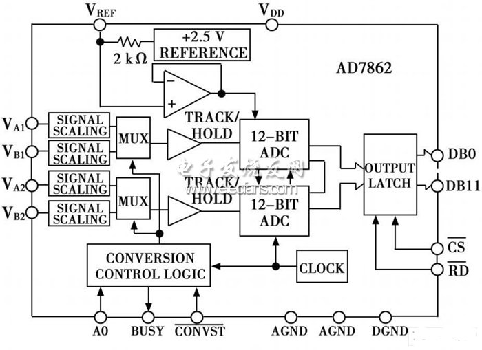AD7862是美国AD I公司出品的12 bit高速, 低功耗转换器, 单电源5伏供电。共有4 个模拟输入端, 被分为两个通道( A& B), 通过输入端A0来进行选择。每一个通道有两个输入端( VA1& VA2或者VB1&VB2) 。能够接受的模拟信号的输入范围为正负10伏。不过模拟信号的输入端的过压保护允许输入电压达到正负17 伏。原理框图如图1所示。