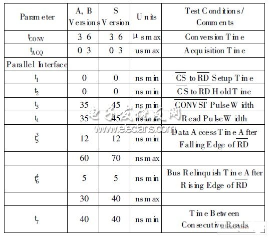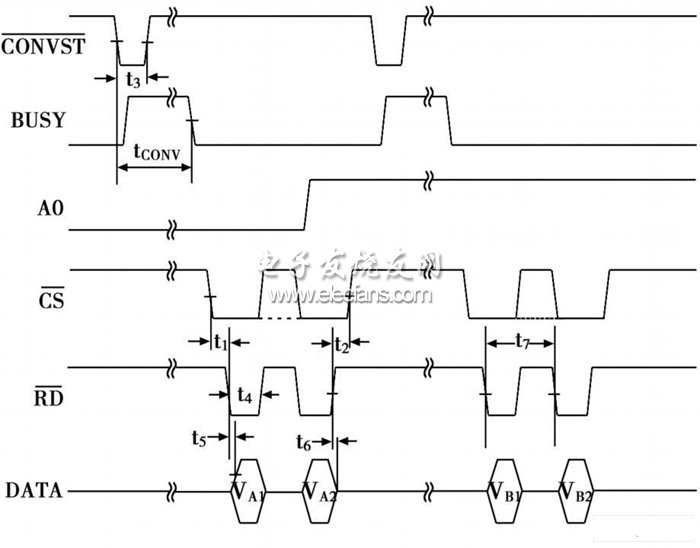 从图2的时序图可以看出AD7862 通过输入脉冲信号CONVST启动转换。在CONVST 信号的下降沿, 片上的两个track /ho ld都同时的被设置为ho ld状态, 两个通道开始进行转换。转换时钟由内置的晶振提供。BUSY 信号指示转换结束, 同时两个通道的转换结果可以被读出。由A0 的值来决定第一次读取的值是VA1 或者VB1, 第二次读取的是VA2或者VB2。当CS信号和RD信号为低时, 数据被从12位的并行数据线上读取。在高速转换模式下, AD7862 的转换时间为3. 6 us, track /ho ld收集时间为0. 3 us。为了保证最佳转换效果, 在转换期间和下一次转换开始前300 ns不能进行读取操作。