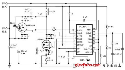 图1就是一种SEPIC实用电路,其输入、输出电压均为5V,开关频率约300kHz,电源变换效率接近90%。其中,UCC39421是一种多用途高效PWM控制器,开关频率可由其“定时电阻(RT)”引脚的外接电阻调整,输出电压则取决于“反馈(FB)”端的电压采样分压器,外接N沟道与P沟道MOSFET分别用作功率开关与同步整流。特别值得注意的是,图中的储能电感分成对称的两半,输入端的能量经由跨接于两个电感之间的电容器向输出端转移,这是SEPIC电路的主要特征。
