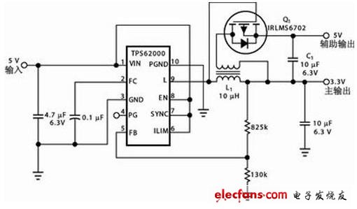 图2是一种设计颇为紧凑的双电压输出电路,工作频率750kHz,变换效率可达95%。其中, 3.3V主电源由降压型单片同步开关电源TPS62000构成;该器件具有软启动功能,能够有效抑制输入浪涌电流与输出电压过冲,最大输出电流600mA。TPS62000的输出端“L”为低电平时,外接P沟道场效应管Q1随之导通而令储能电感L1副绕组的感应电压向输出电容C1充电,C1之端电压同3.3V主输出叠加即为辅助输出电压,其数值取决于L1主、副绕组的匝数比;辅助输出若为5V,匝数比可取2:1。