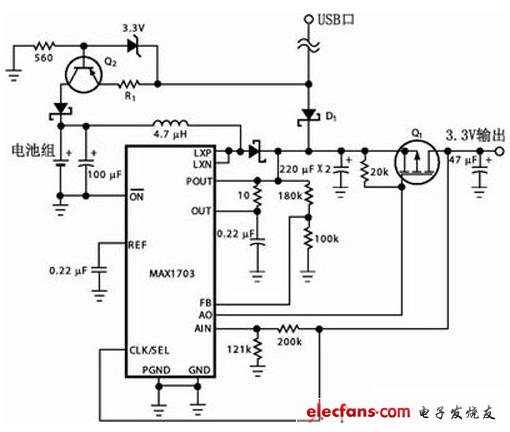 不少便携式USB设备脱离主机后改由内部电池组通过直流变换器继续供电,故而需要配备一个小型UPS电源,图3便是一种由单片开关电源MAX1703构成的实用电路。该集成器件采用同步整流PWM升压型电路结构;可以单节镍镉/镍氢电池供电,最低输入电压0.7V,输出电压可调范围为2.5~5.5V,最大输出电流1.5A,电源变换效率可达95%。图3中,MAX1703开关电源“POUT”端的输出电压设定为3.4V,而由P沟道场效应管Q1与片内备用放大器构成的线性稳压器输出电压为3.3V,故而USB外设由电池组供电时Q1的功率损耗几乎可以忽略。外部设备与USB口接通时,二极管D1为正向偏置而使开关电源处于“空闲”状态;也就是只要Q1的源极电压高于3.4V,外部设备便始终由USB口供电。与此同时,USB口还通过PNP晶体管Q2等组成的恒流源向电池组充电,调整电阻R1的阻值可以设定充电电流,使之符合十小时充电制的要求。一旦外部设备脱离USB口,开关电源便会立即退出“空闲”状态而由内部电池组继续供电。