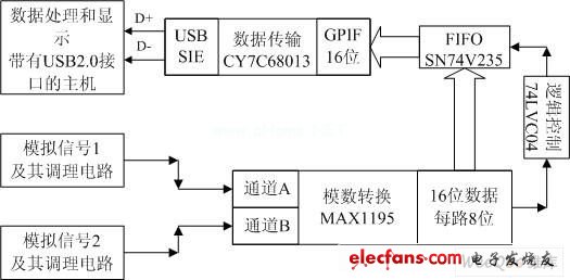 MAX1195的两路输入信号是同时被采样的,十六位的数据输出总线使两路数据可以同时输出,分别占八位,即:D0A~D7A和D0B~D7B;SN74V235输入为18位,根据CMOS技术的要求,将未使用的D16和D17引脚接地。MAX1195采集到的数据首先送进FIFO里, FIFO的写时钟(WCLK)和AD的转换时钟反相,这样可以充分满足MAX1195输出数据的建立时间,避免发生数据丢失或者数据重复写入现象。 SN74V235的 (Programmable Almost Full)可编程几乎满信号经74LVC04反相后接MAX1195的Sleep和 引脚,以免FIFO发生溢出而丢失数据。SN74V235的数据输出引脚Q0~Q15与CY7C68013的GPIF模式下的数据线FD[15:0]即端口B和端口D组成的十六位数据总线相连,数据SN74V235到EZ-USB FX2的时序过程由CY7C68013的GPIF 控制。FX2采用了“量子FIFO”结构,在FX2里面,数据可以分为两个域:USB域和GPIF接口域。这两个域是独立的,允许分别使用不同的时钟和逻辑控制数据的传输,USB域是由SIE控制的,SIE通过USB口接收或者发送端点FIFO的数据。FX2的“量子FIFO”能够几乎不花时间在这两个数据域中的转移数据,因为这两个域用的FIFO在物理上是同一个。所以根据“量子FIFO”原理,实际上数据已经存在于属于USB域的端点FIFO里面了,采用USB的BULK传输方式,使该数据完全不经过低频CPU干预,而是采用FX2提供的AutoIn模式,即一旦FX2端点缓冲区的数据达到指定字节数,数据将自动被打包从USB口上传到主机。