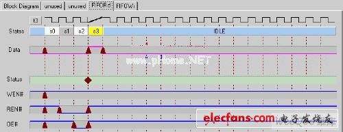 图2 GPIF与SN74V235详细连接图GPIF状态机可以定义四个波形描述符,一般情况下是:FIFO读,FIFO写,单字/字节读,单字/字节写。Cypress提供了图形化的波形描述工具GPIF Designer,用户只需要给出GPIF波形,GPIF Designer会自动生成C语言的波形代码Gpif.c,可以直接链接到用户的固件程序中。本文中用到了FIFORd描述符,波形如图3所示。