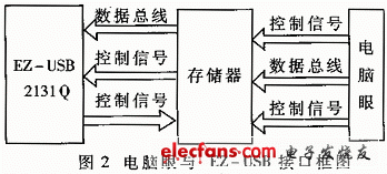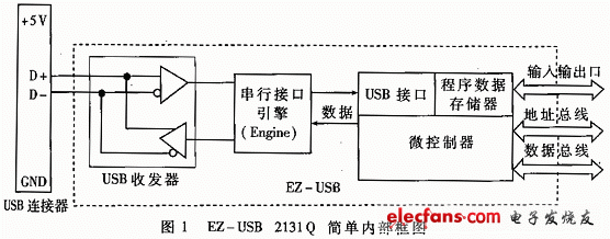 考虑到USB传输速率较高,如果利用只实现Engine功能的芯片,外加一个普通微控制器(如8051),其处理速度就会很慢而达不到USB传输要求。USB外设作为消费类产品的目的之一在于降低产品成本,如果采用高速微处理器(如DSP),满足了USB传输速率,但成本较高。在各方面比较下,选择了内置有微控制器的芯片EZ-USB 2131Q。