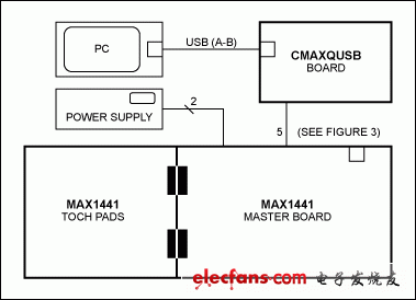 用电缆连接CAMXQUSB接口板和MAX1441评估板。
