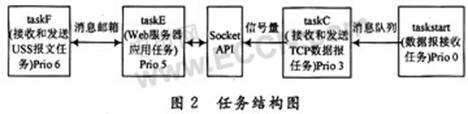 在μCO/S-II操作系统中,根据尽量减少任务数以提高CPU利用率的原则,本设计建立了四个任务。这四个任务是:taskstart(启动任务)、taskC(接收TCP信号量任务)、taskE(TCP数据处理任务)、taskF(接收和发送USS报文任务)。四个任务之间的关系,各自的优先级设置及任务间的通信机制如图2所示。