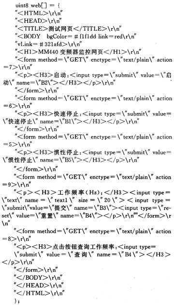 在Web服务器中,建立一个接收数据缓冲区数组tempdata[400],用它来存储从浏览器发来的数据。根据URL的格式,能从URL中获得表单中提交的数据。它们被相关程序处理后会按照USS协议保存到数组SndData[12]中。参数P2009[0]=0对USS进行了标称化,频率的计算就要按照规格化进行。这个数组通过串口发送到变频器之后,就可以使变频器按照要求频率工作了。