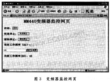在主监控网页中,可以任意设置变频器的工作频率,也可以实时监控其工作状态。图3就是本系统的Web监控网页。
