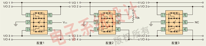 配置选择2采用偏置及电源隔离电阻来保护4条数据线路。该器件可在引脚5与VCC之间串联10kΩ电阻实现与电源隔离。这将在内部TVS及控向二极管上维持偏置,并降低它们的电容。