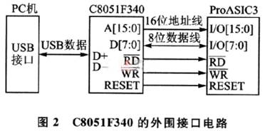 由于C8051F340片内集成了一个USB总线控制器,因此它与上位机的USB通信直接通过D+和D-两个差分信号引脚完成的,接口非常简单。C-8051F340与Pr0ASIC3之间的通信通过C8051F340的8位数据线、16位地址线,以及读()、写()、复位(RESET)3个控制信号来完成。