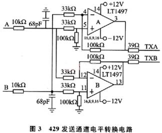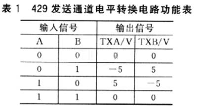 429发送通道电平转换电路的功能是将ProASIC3产生的CMOS电平信号转换为429电平信号。目前有几家公司专门从事429通信芯片的生产,其中也包括429发送通道电平转换芯片。采用这种专用芯片的优点是接口电路设计简单,缺点是芯片价格昂贵。本设计的需求为8路发送通道,从成本上考虑,不易采用专用芯片,而是利用集成运放设计发送通道的电平转换电路。图3为429发送通道电平转换电路。图中的A和B是由ProASIC3产生的信号,TXA和TXB是经电平转换电路调理后形成的ARINC429信号。表1为429发送通道电平转换电路的功能表。