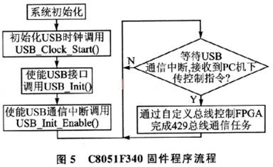 C8051F340固件程序的开发是在Silicon Labs公司的C8051Fxxx IDE集成开发环境下完成的,采用C语言编程。Silicon Labs公司专为USB开发推出了USBXpress工具,USBXpress将单片机固件程序和上位机应用程序所需的USB设备驱动函数进行了封装,开发人员只需调用相关函数即可。图5为C8051F340固件程序的流程。其中,USB_clock_Start()、USB_Init()、USB_Int_Enable()均由USBXpress工具提供,可直接调用。