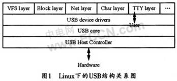 Linux操作系统中有一个叫做“USB core”的子系统,可提供支持USB设备驱动程序的API和USB主机控制器的驱动程序。同时提供有许多数据结构、宏定义和功能函数来对硬件或设备进行支持。在Linux下编写USB设备的驱动程序时,从严格意义上讲,就是使用这些USB core的子系统所定义的数据结构、宏和函数来编写数据的处理功能。在Linux下,core、host controller和driver三者之间的关系如图1所示。