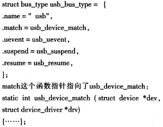 Linux设备模型中的总线落实在USB子系统里就是usb_bus_type,它在usb_init函数中可用retval=bus_register(&usb_bus_type)语句注册,而在driver.c文件里的定义如下: