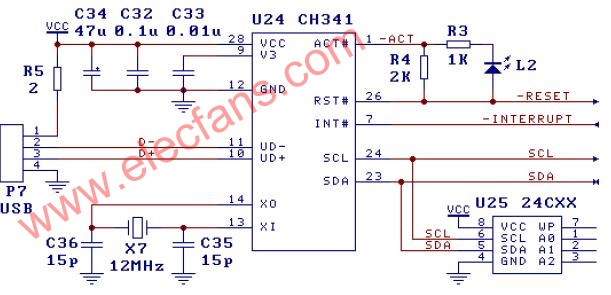 图中使用电阻R4 强制ACT#引脚在CH341 功能配置期间为低电平,从而禁止CH341配置时访问2