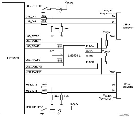 图13。LPC2930 USB OTG端口配置图:USB端口1 主机,USB端口2主机