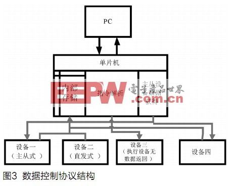 主要采用协议地址的方式判明指令针对的设备,需要在单片机中对于指令按照预先编制的指令协议进行指令的解析,形成针对各自设备的指令码向下转发。具体的数据协议控制图见图3,多串口硬件见图4。