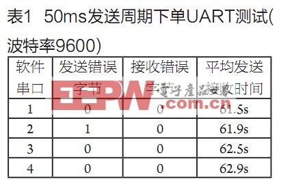 (1)为了验证单个软件UART可用首先利用串口调试助手随机发送数据,选择不同的自动发送周期,每个发送周期连续1000字节数据发送检验数据接收和发送错误率,实验结果见表1。