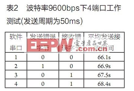 通过以上数据我们可以看到软件UART在发送和接收时间上存在延迟,因为利用中断和单片机对于数据的转发造成了数据传输的延迟,这是不可避免的,只要保证较高的单片机时钟频率,这种延时可以尽量的减小。其次当发送周期较短时,扩展串口的错误较高,但是延迟到50ms发送周期后这种错误基本解决。因此当传输周期越长,数据错误率越低。(2)定波特率下,4UART同时工作的测试结果见表2。