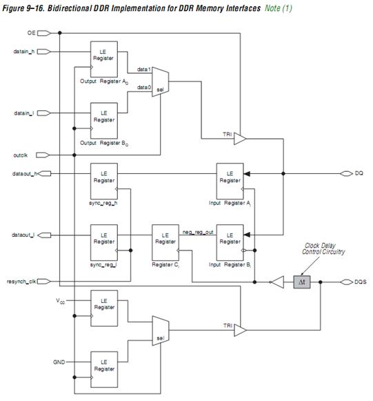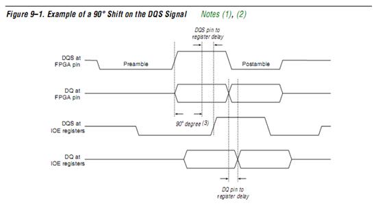 Cyclone II器件有专用的与DDR SDRAM接口的data(DQ),data strobe(DQS),clock管脚。一般是8个DQ信号对应与1个DQS信号,DQS信号和DQ信号从DDR SDRAM输出时是沿对齐的。进入FPGA后要想实现中心对齐,即DQS的变化沿与DQ的中心对齐,那么必须在FPGA内部对DQS做延时处理,如Figure 9-1所示。