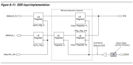 DDR输入接口实现如Figure 9-11所示。这也是一个涉及到异步时钟域数据通信的问题,且看它是如何进行同步的。resynch_clk是FPGA内部使用的时钟,DQS相对与和DQ同步的时钟。这两个时钟其实是同频不同相,相位偏移肯定是要满足FPGA的采样时钟和数据信号中心对齐,这涉及到DDR SDRAM的输出时钟信号的相位调整。