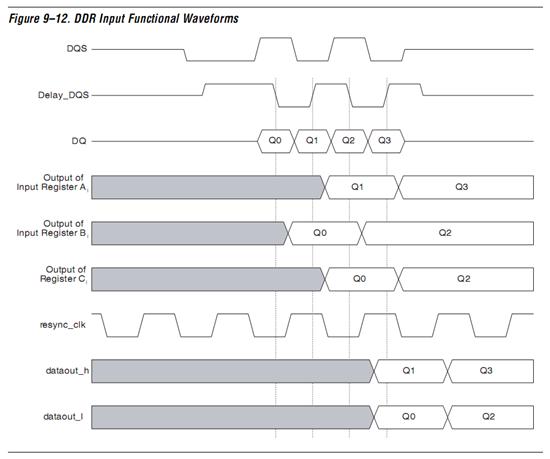 输入信号DQS经过反向延时后与DQ信号中心对齐,然后分别使用方向延时后的DQS信号的下降沿和上升沿锁存DQ信号前后输入的数据Q0和Q1,同时在上升沿时会对前一级采样的Q0信号再进行一次锁存,从而使Q0和Q1信号在被FPGA同步时钟采样前达到同频同相。FPGA内部时钟通过对经过处理后的Q0和Q1信号采样达到了双沿数据输入的采样。详细波形如Figure 9-12所示。