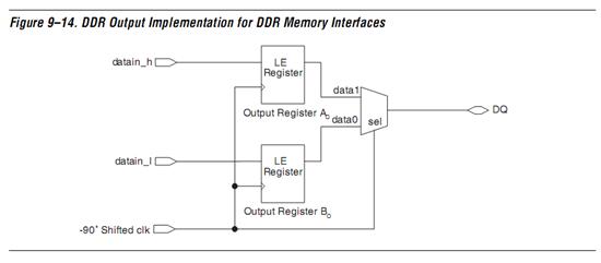 DDR输出接口实现如Figure 9-14所示。经过90度相移的DDR SDRAM时钟先对FPGA内部时钟域的待输出信号进行一次锁存,然后由相移时钟的高低电平选择作为当前输出给DDR SDRAM的数据信号。