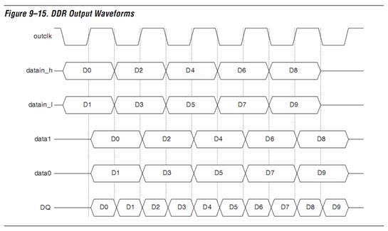 在不增加电路板复杂度的情况下要想增强系统性能,改善数据位宽是一个有效的手段。通常来说,可以把系统频率扩大一倍或者把数据I/O管脚增加一倍来实现双倍的数据位宽。这两种方法都是我们不希望用到的,因为它们会增加整个设计系统的复杂度。在总的数据I/O管脚不变的情况下,使用双数据率(DDR)I/O管脚来传输和接收数据也能够实现双倍数据位宽的要求。DDR器件使用时钟的两个沿来传输数据,在时钟频率和数据I/O管脚不变的前提下,比单沿数据传输(SDR)器件快了一倍。DDR数据传输广泛应用于有快速数据传输需求的场合,如网络、通信、存储和图像处理等领域。