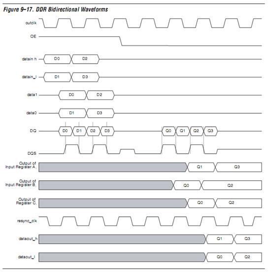 双向接口的实现只是将前面讨论的输入和输出方式进行综合。不论是DQ还是DQS信号,在作为FPGA的输入管脚时,内部给这个管脚的赋值为高阻态,从而确保读取的输入信号有效。