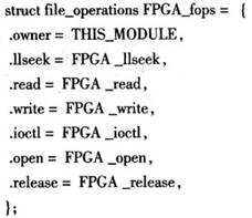 file_operation结构是一个用字符驱动方式建立设备编号和设备操作的连接结构,定义在.是一个函数指针的集合。每个打开文件与它自身的函数集合相关,这些操作大部分可由系统调用,例如:open(),read ()等等。典型的file_operation结构可用FPGA设备列表所示,其代码如下: