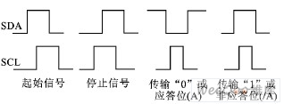 图1中包括起始信号、停止信号、应答信号、非应答信号以及传输数据“0”和数据“1”的时序。起始信号就是在SCL线为高时SDA线从高变化到低;停止信号就是在SCL线为高时SDA线从低变化到高;应答信号是在SCL为高时SDA为低;非应答信号相反,是在SCL为高时SDA为高。传输数据“0”和数据“1”与发送应答位和非应答位时序图是相同的。
