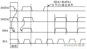 图3是以两个节点为例的仲裁过程。DATA1和DATA2分别是主节点向总线所发送的数据信号,SDA为总线上所呈现的数据信号,SCL是总线上所呈现的时钟信号。当主节点1、2同时发送起始信号时,两个主节点都发送了高电平信号。这时总线上呈现的信号为高电平,两个主节点都检测到总线上的信号与自己发送的信号相同,继续发送数据。第2个时钟周期,2个主节点都发送低电平信号,在总线上呈现的信号为低电平,仍继续发送数据。在第3个时钟周期,主节点1发送高电平信号,而主节点2发送低电平信号。根据总线的线“与”的逻辑功能,总线上的信号为低电平,这时主节点1检测到总线上的数据和自己所发送的数据不一样,就断开数据的输出级,转为从机接收状态。这样主节点2就赢得了总线,而且数据没有丢失,即总线的数据与主节点2所发送的数据一样,而主节点1在转为从节点后继续接收数据,同样也没有丢掉SDA线上的数据。因此在仲裁过程中数据没有丢失。