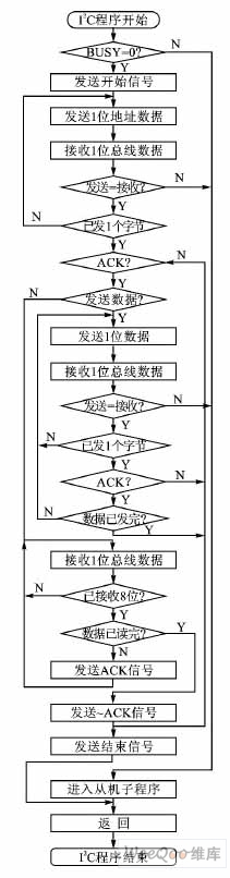 图5给出了从节点的流程。进入从节点时,要将BUSY置为高,说明MCU现在正在工作,不能完成其他的任务。在MCU作为从节点完成接收任务后,要将BUSY置为低。MCU在接收到寻址字节后与自己的地址字节进行比较。如果是访问自己的就进入到下面的接收程序,否则跳出。在访问自己的时候,还要判断主节点是读取数据还是写数据,以便进入相应的程序。在写字节的子程序中,从节点每发送1个字节的数据后都要察看是否有应答信号(ACK),有则说明数据接收到了;否则要跳出等待,重新发送。在读字节的子程序中,每接收1个字节的数据就要发送1个应答信号(ACK),以示接收正常,否则主节点将停止继续发送。在现有的资料中,关于从节点的原理和源代码比较少,这里给出作为从节点时写字节子程序的源代码。由于篇幅有限其他的子程序没有列出。
