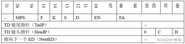 在OHCI 上,每个ED 对应一个USB 设备端点,不同的设备端点拥有不同的ED。同种 传输类型的ED 组成一链表,OHCI 有三种ED 链表:控制传输数据链表、批量传输数据链 表和周期性数据链表(中断数据传输和等时数据传输同属此类),HC 通过相应的操作寄存 器访问各个链表。每个ED 是4 个32 位数组成的结构。如下表: